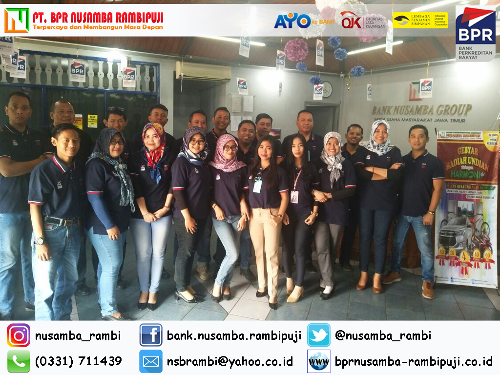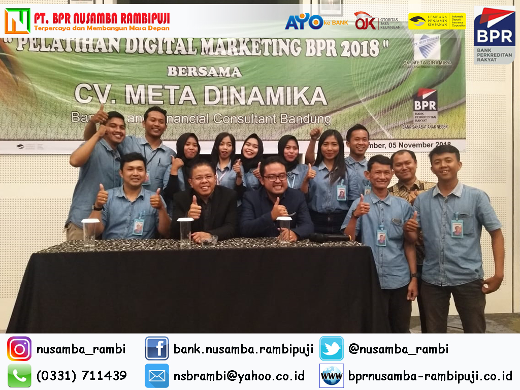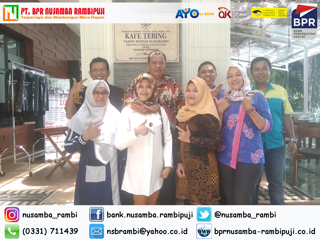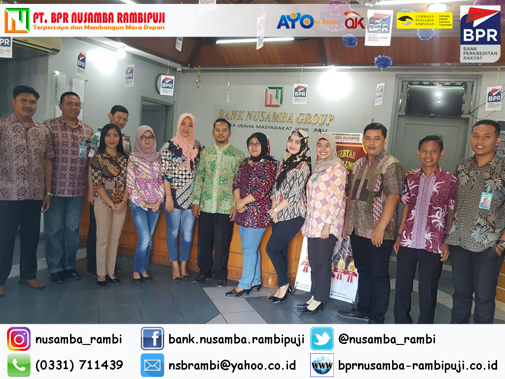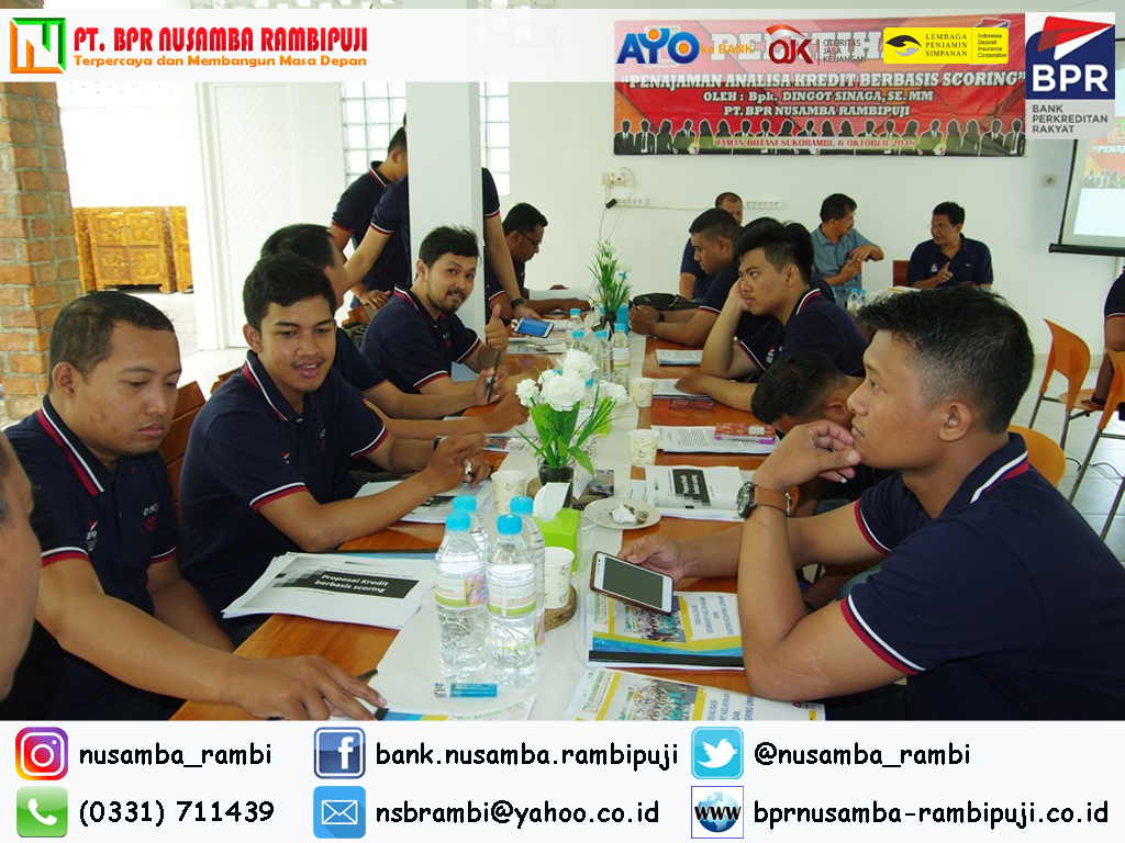Pada tanggal 6 Oktober 2018 bertempat di Ruang Meeting Taman Botani Sukorambi Jember, PT. BPR NUSAMBA RAMBIPUJI mengadakan Pelatihan Penajaman Analisa Kredit Berbasis Scoring dengan pemateri Bapak Dingot Sinaga, SE. MM selaku Komisaris Utama PT. BPR NUSAMBA RAMBIPUJI yang diikuti oleh Dewan Direksi, Kepala Bidang, Kepala Kantor Kas, Staff Account Officer, dan Staff Funding Officer.