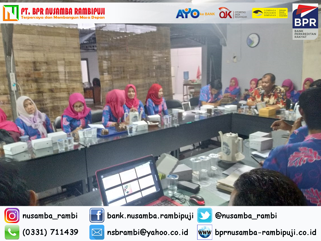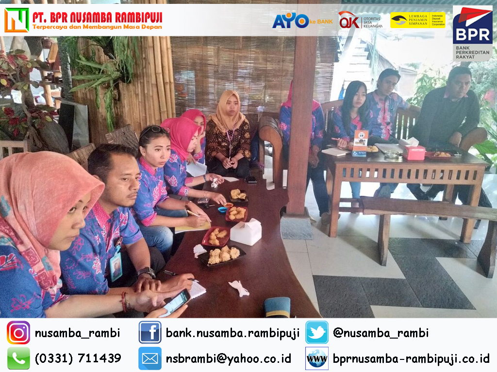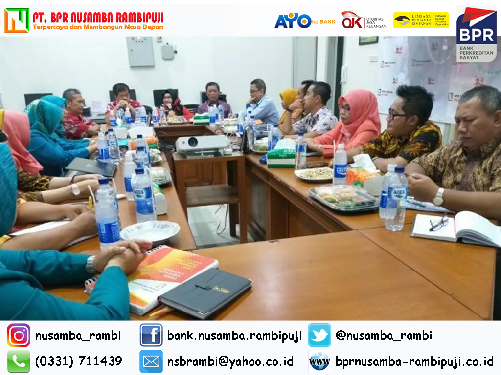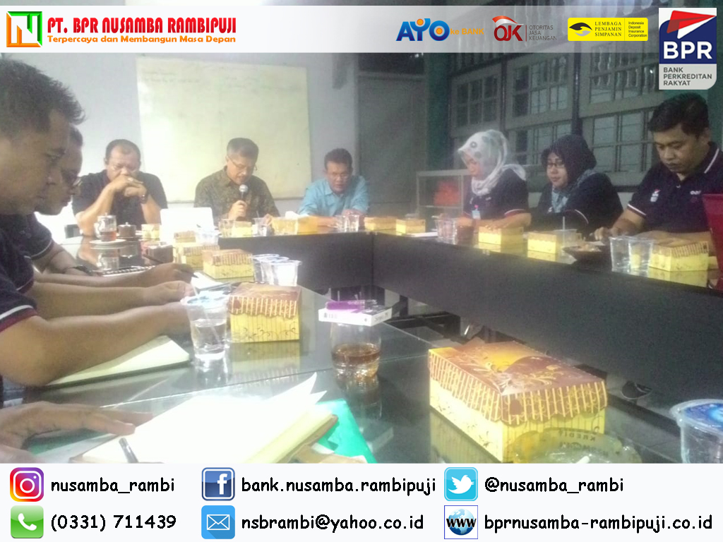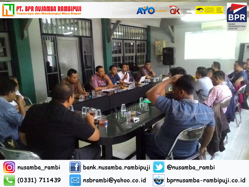 Pada tanggal 15 Oktober 2018 bertempat di Kantor Pusat PT. BPR NUSAMBA WLINGI, tim SKAI dan KEPATUHAN melakukan Rapat Koordinasi Triwulanan yang membahas mengenai kinerja dan performance serta sharing bersama terkait dengan AUDIT dan KEPATUHAN, yang diikuti oleh PT. BPR NUSAMBA RAMBIPUJI, PT. BPR NUSAMBA WLINGI, PT. BPR NUSAMBA GENTENG, PT. BPR NUSAMBA BRONDONG, PT. BPR NUSAMBA NGUNUT, PT. BPRS MITRA HARMONI MALANG.